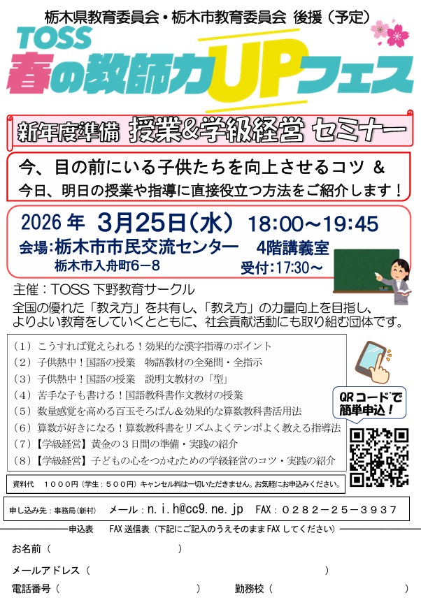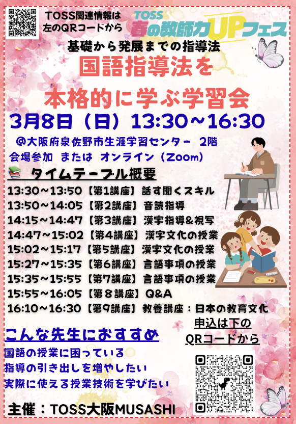 「TOSS春の教師力UPフェス」は、全国のTOSSサークルが主催する、先生・学生等を対象とした、授業や学級経営の基礎基本をみにつけるための入門セミナーです。