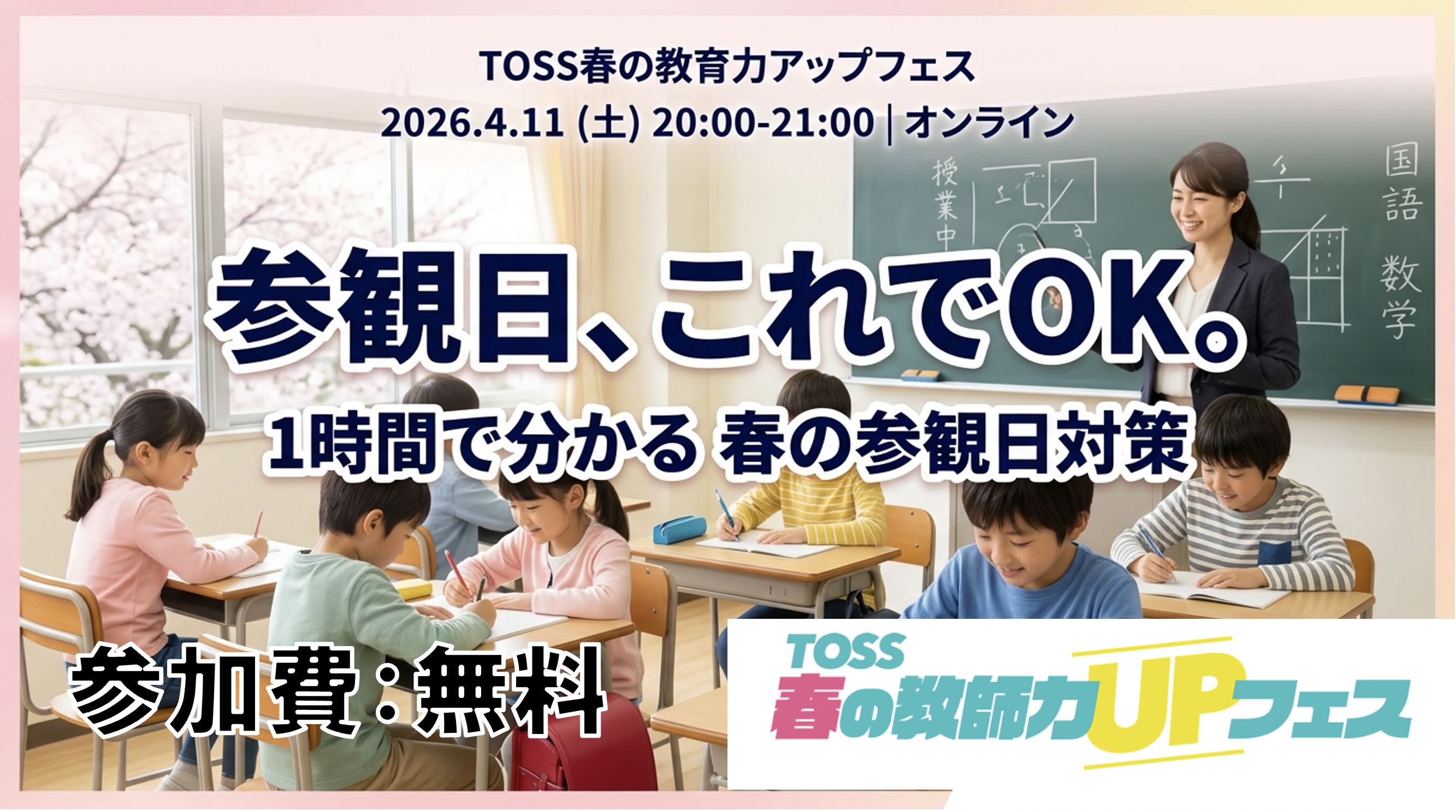 2026年4月11日(土)20:00〜21:00、オンラインでTOSS春の教育力アップフェスを開催します。講師は塩谷直大…